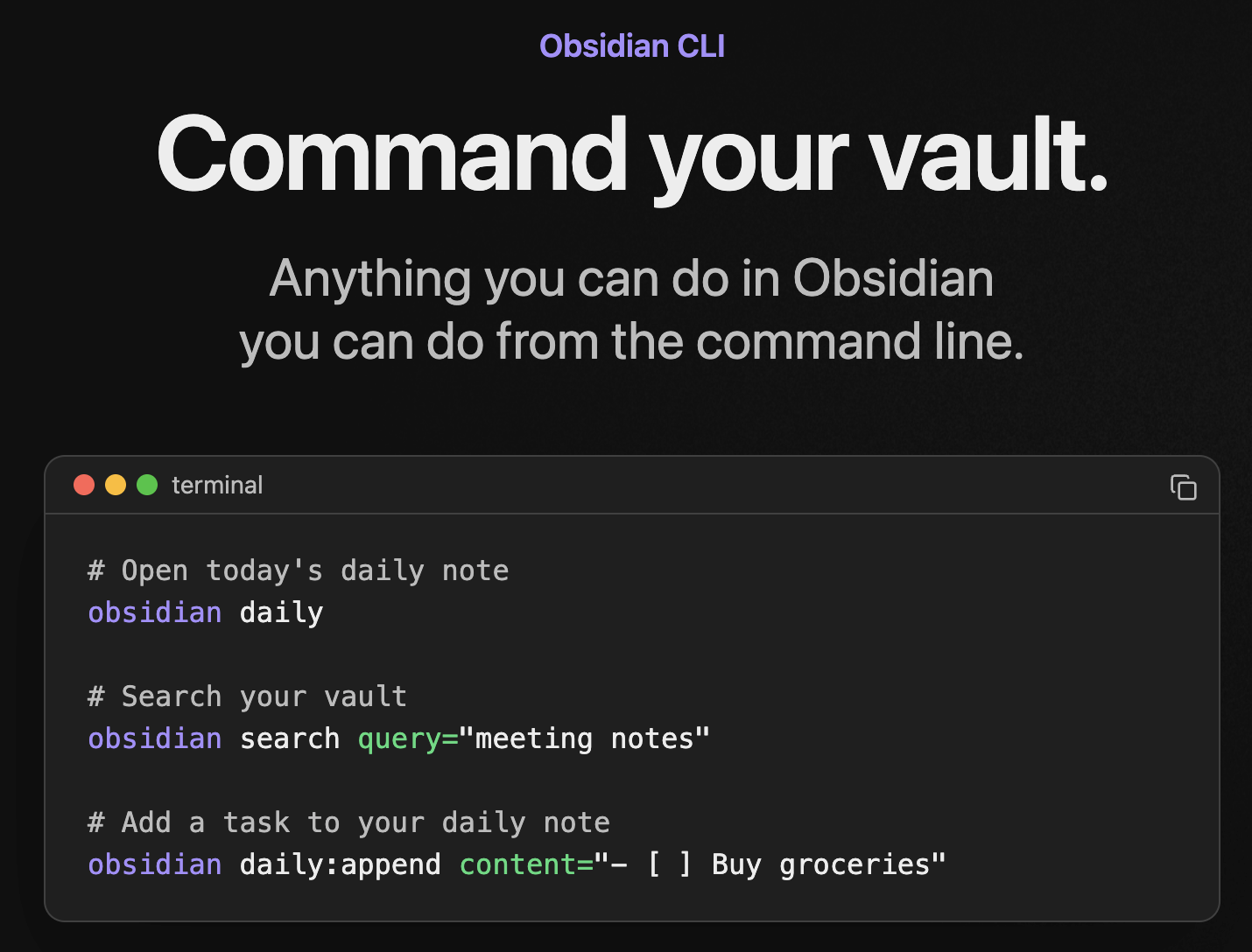 ํฐ๋ฏธ๋์์ ๋ ธํธ ์ฝ๊ธฐ, ๊ฒ์, ์ฐ๊ธฐ๊ฐ ๊ฐ๋ฅํ ์ปค๋งจ๋๋ผ์ธ ์ธํฐํ์ด์ค์ด๋ค. Daily note ์ด๊ธฐ, ํ์คํฌ ๊ด๋ฆฌ, ํ ํ๋ฆฟ์ ํ์ฉํ ๋ ธํธ ์์ฑ ๋ฑ์ ์ง์ํ๋ค. GUI ์์ด Obsidian Sync๋ฅผ ์คํํ ์ ์์ด์ ์๋ฒ๋ ์๋ํ ํ๊ฒฝ์์ ์ ์ฉํ๊ณ , AI ์์ด์ ํธ ๋๊ตฌ์์ ์ฐ๋๋ ๊ฐ๋ฅํ๋ค.