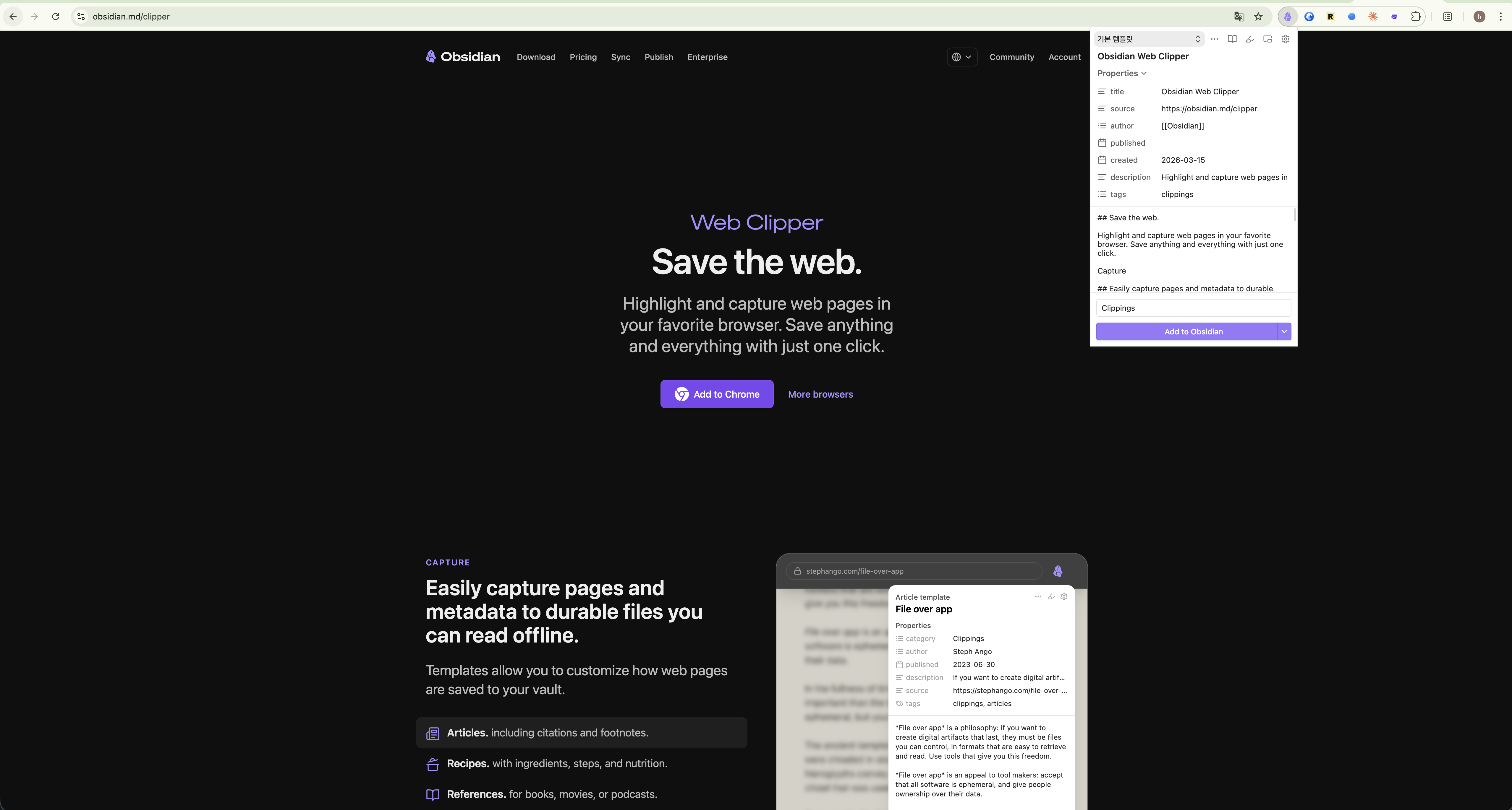 ๋ธ๋ผ์ฐ์ ํ์ฅ ํ๋ก๊ทธ๋จ์ ํตํด ์น ์ฝํ ์ธ ๋ฅผ Obsidian ๋ ธํธ๋ก ์บก์ฒํ ์ ์๋ค. ์น ํ์ด์ง์ ์ ์ฒด ๋๋ ์ผ๋ถ๋ฅผ ๋งํฌ๋ค์ด์ผ๋ก ๋ณํํ์ฌ ์ ์ฅํ๋ค.