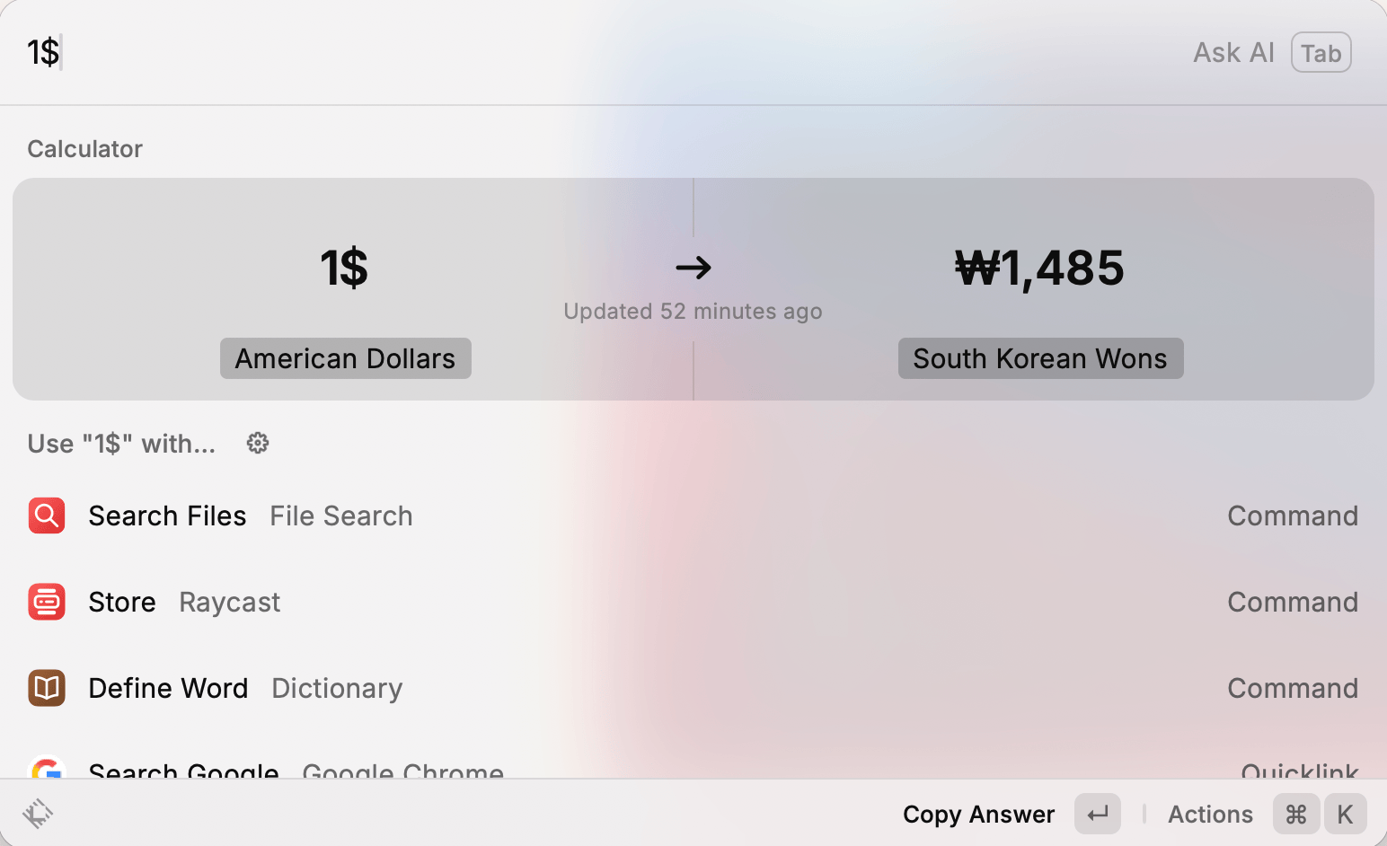 ๋ ฅํ๊ณ , Enter๋ก ์คํํ๋ ํจํด์ด ๊ฑฐ์ ๋ชจ๋ ๊ธฐ๋ฅ์ ๊ณตํต์ผ๋ก ์ ์ฉ๋๋ค. ๊ทธ๋์ ์ ๊ธฐ๋ฅ์ ๋ฐฐ์๋ ์ฌ์ฉ ๋ฐฉ์์ด ํฌ๊ฒ ๋ฌ๋ผ์ง์ง ์๋๋ค. ์ด ์ผ๊ด์ฑ์ด Raycast๋ฅผ ์ค๋ ์ฐ๊ฒ ๋ง๋๋ ํต์ฌ์ด๋ค.