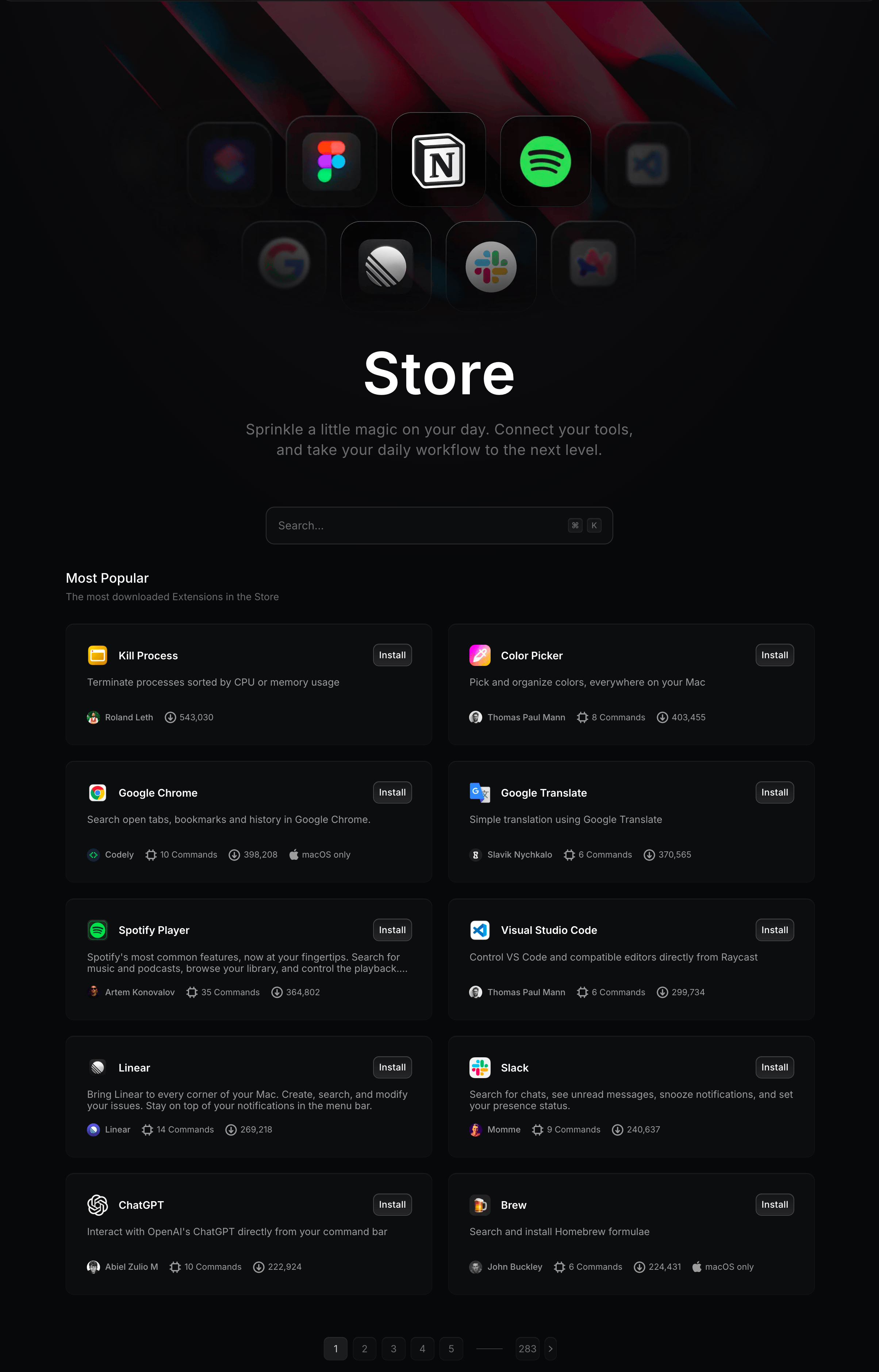 ์๋ฅผ ๋ค์ด GitHub ์ด์๋ฅผ ์ฐพ๊ฑฐ๋, Notion ํ์ด์ง๋ฅผ ๋ง๋ค๊ฑฐ๋, Google Calendar ์ผ์ ์ ํ์ธํ๊ฑฐ๋, Slack ์ํ๋ฅผ ๋ฐ๊พธ๋ ์ผ์ ๋ธ๋ผ์ฐ์ ํญ์ ์ด์ง ์๊ณ ๋ ์ฒ๋ฆฌํ ์ ์๋ค. ๊ณต์ Store์๋ ์ปค๋ฎค๋ํฐ๊ฐ ๋ง๋ ํ์ฅ์ด ์์ฃผ ๋ง์ด ์ฌ๋ผ์ ์์ด์, ๋๊ตฌ ํ๋๋ฅผ ์ถ๊ฐํ ๋๋ง๋ค Raycast๊ฐ ์กฐ๊ธ์ฉ ๋ ๊ฐ์ธํ๋๋ค.